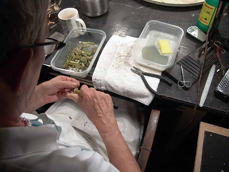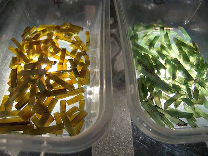 All glass pieces of the "greek keys" are stored in two boxes, one for the light green and the other one for the golden glass